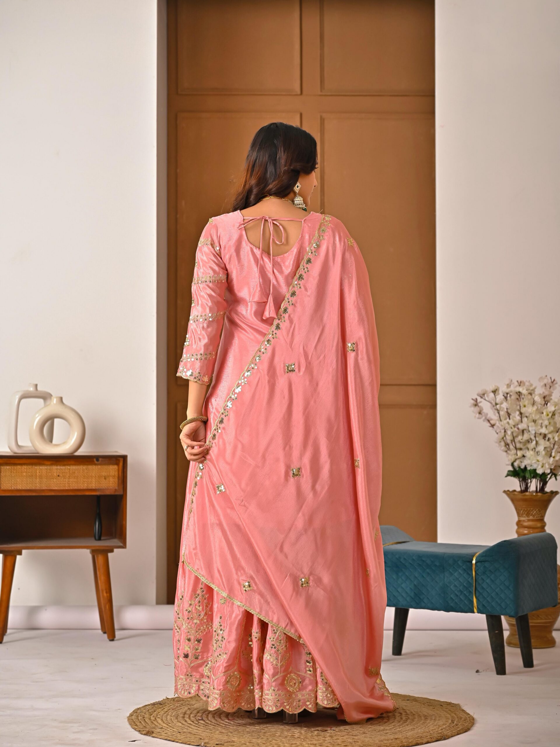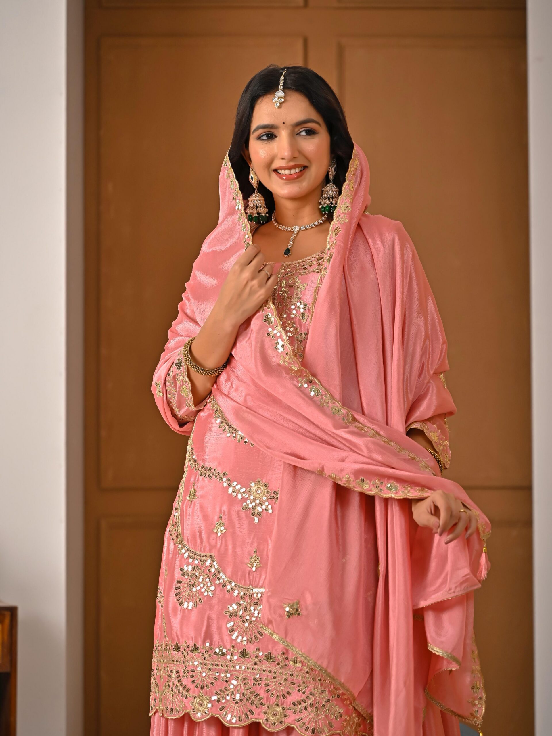 Peach Chinon Silk Embroider Lace Work Salwar Suit