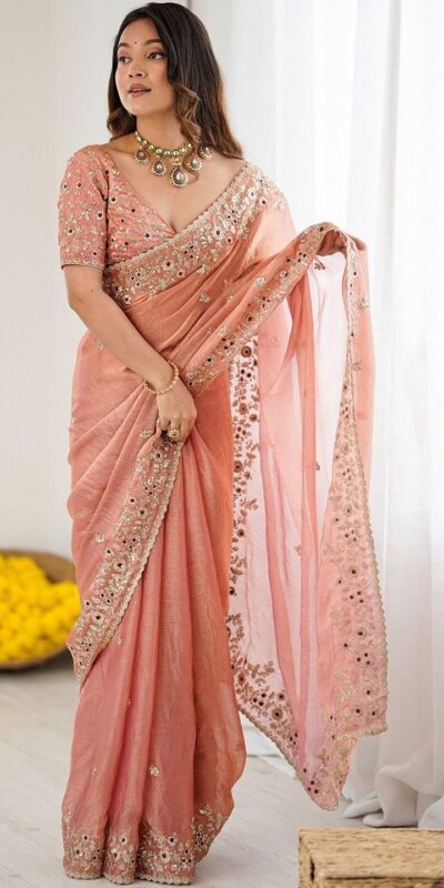 Peach Fandy Chiffon Embroidery Cut Work Saree