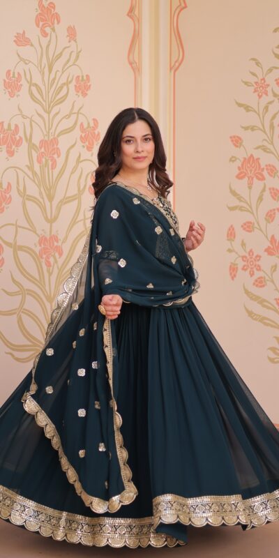 Peacock Blue Faux Blooming Embroidery Zari Work Gown