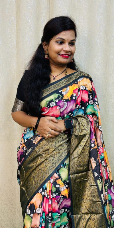 MS Black Color Jacquard Dola Silk With Kalamkari Print Saree Casual, Wedding, Festive, Events . Expected Delivery 4-6 Working Days @1549/- only