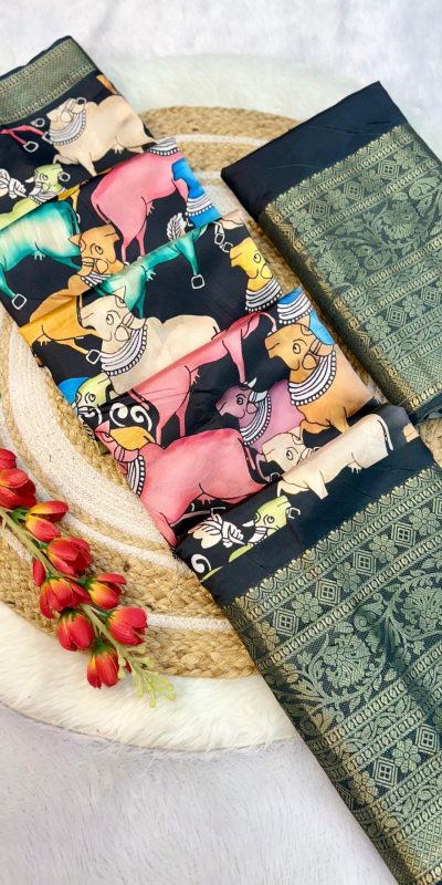 Perfect Black Color Jacquard Dola Silk With Kalamkari Print Saree