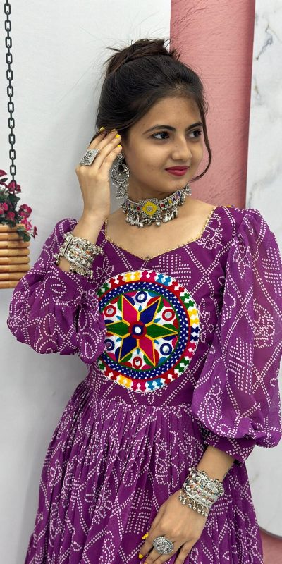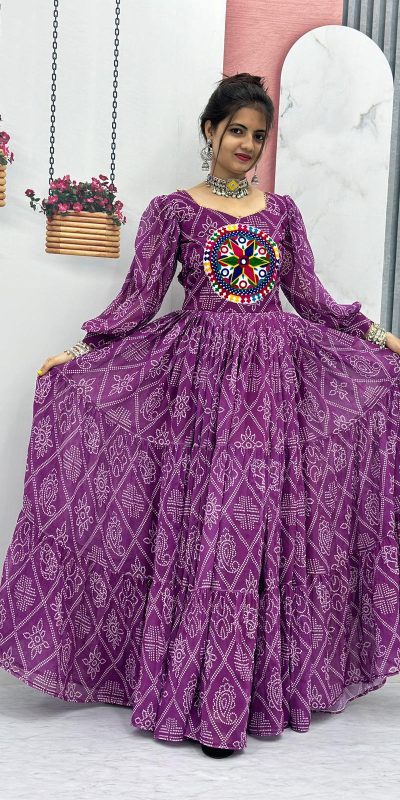 PC N02 Purple Color Bandhani Printed Gamathi Mirror Work Gown Casual, Party Wear, Events, Festivals Wear Expected Delivery 4-6 Working Days @1929/-