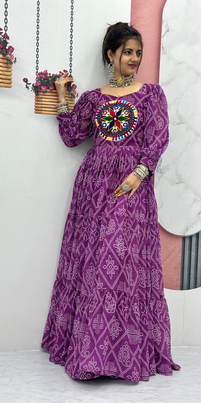 Perfect Purple Color Bandhani Printed Gamathi Mirror Work Gown