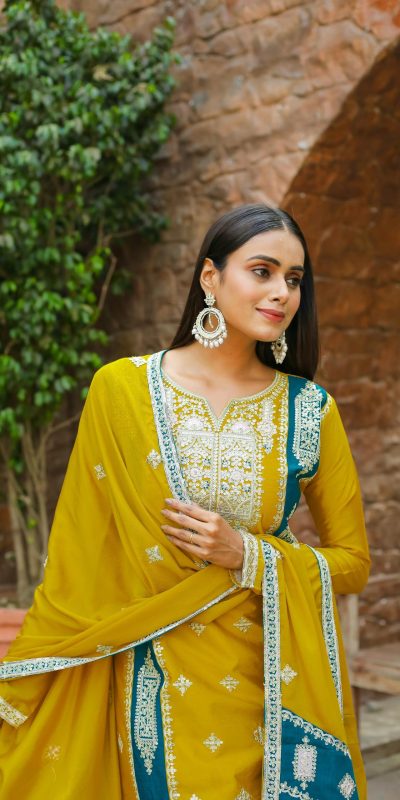 Perfect Yellow Chinon Silk Embroidery Sequence Sharara Suit