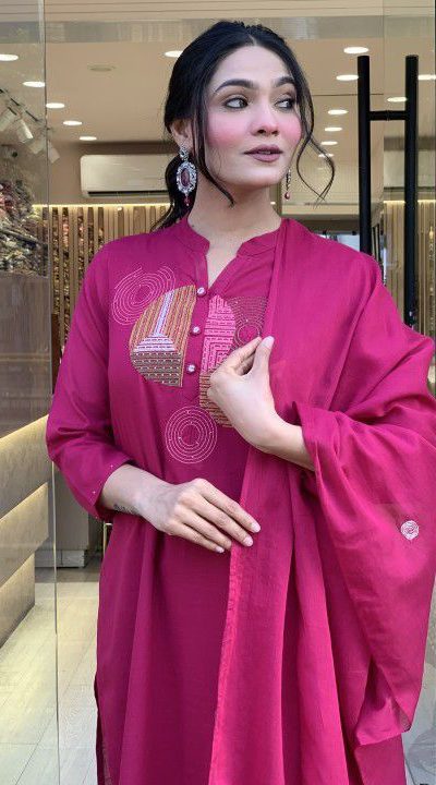 Fabrics : ChanderiWork : Embroidery Mirror Work Pant : Chanderi Dupatta : Minimalist embellishments with delicate work embroidery, ensuring a balanced aesthetic. |