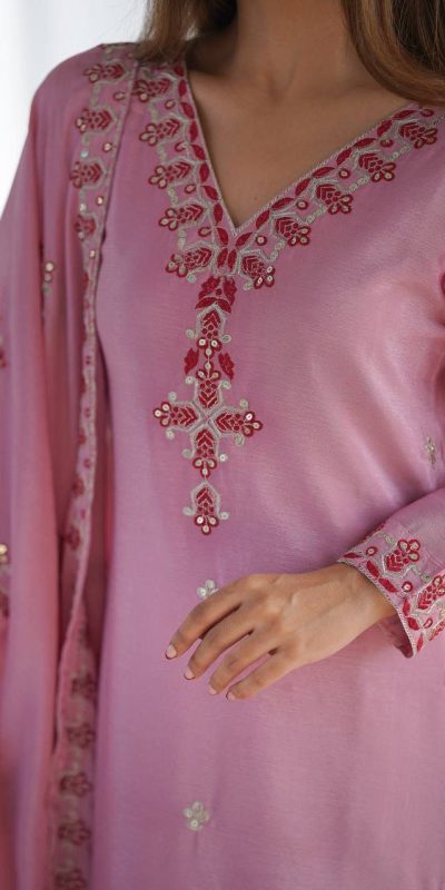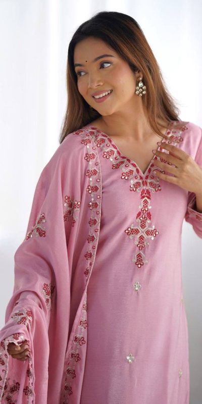 Pink Chinnon Silk Lace Embroidery Work Salwar Suit