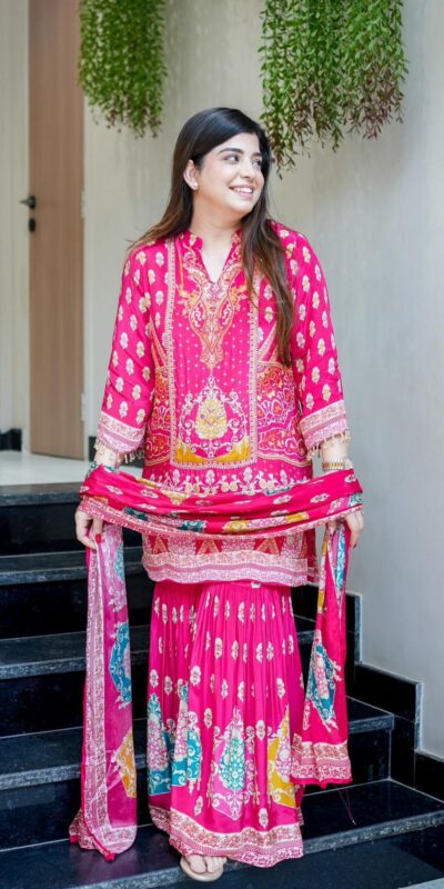 Fabric Details:- top Fabrics : Printed French Crape work:real Mirror Work inner : Micro height : Inch size : Free Size Semi Stitched Sharara Detail fabrics : Printed French Crape Size : Free Size (Full stitched) height : 40”inch Dupatta Details: fabric: Printed French Crape With 2.2 Mtr |