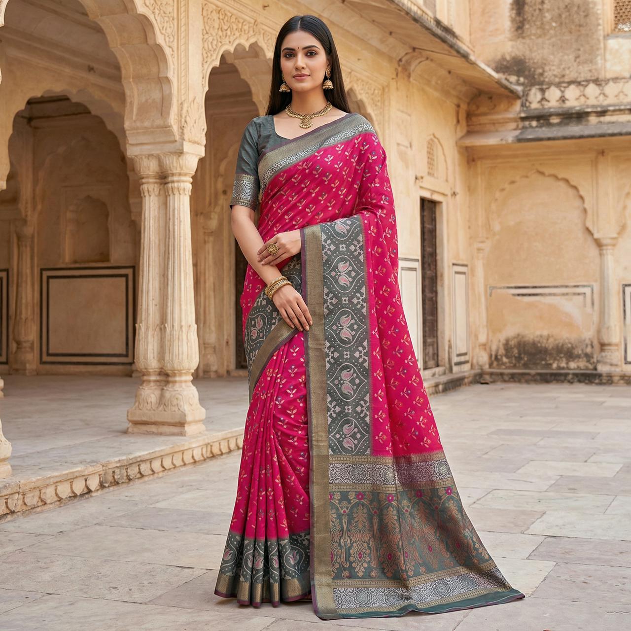 blend for a lustrous yet soft With traditional Ikkat Pattern Contrast Border & Pallu with Zari Border which will give you a yet attractive look. The best part of this woven work.