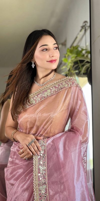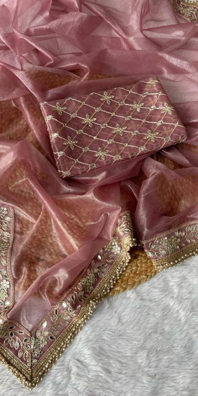Pink Silver Tissue Silk Zari Mirror Work Saree