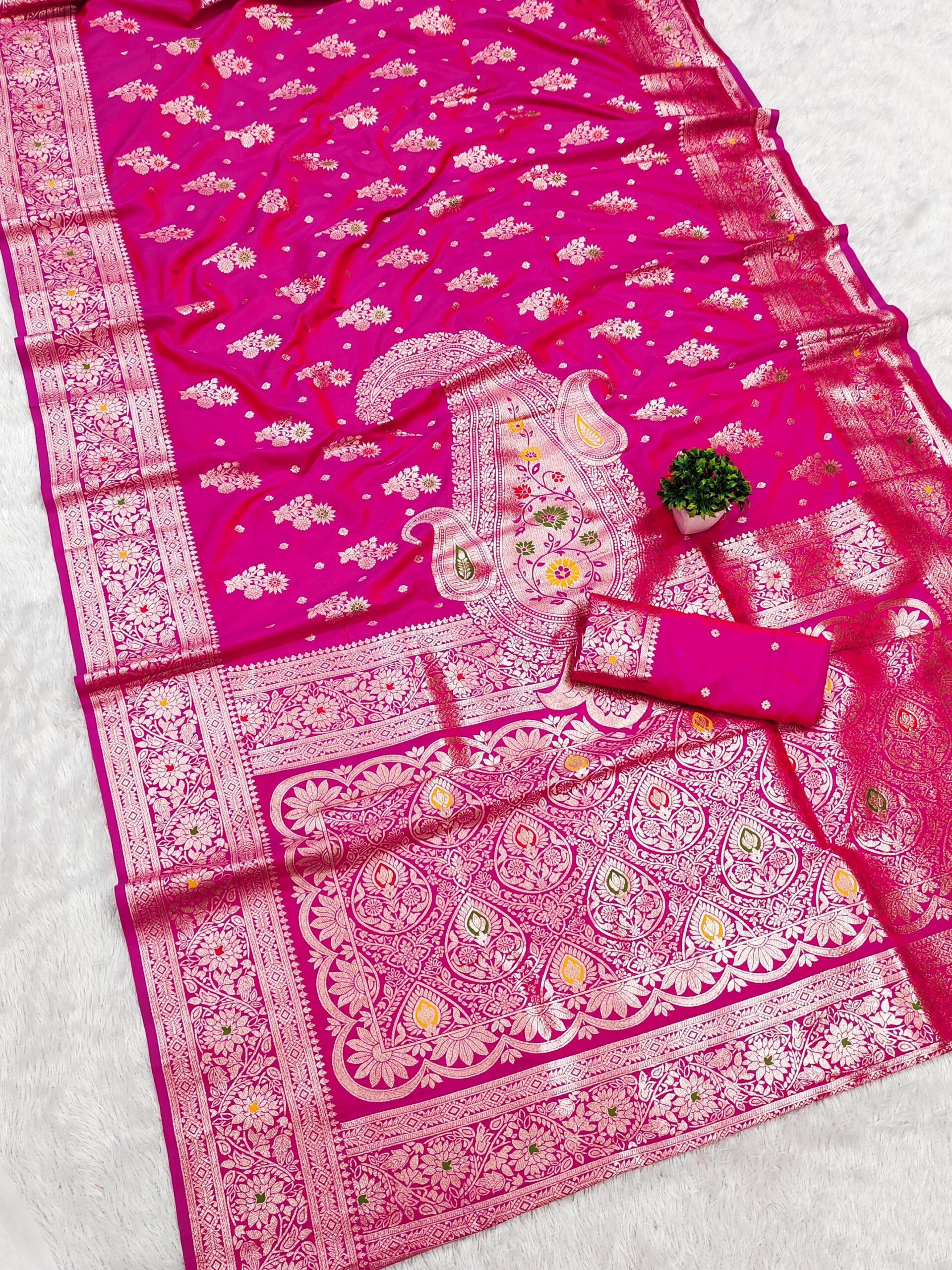 Saree :- Soft banarasi silk with gold zari weaving design motifs all over the & zari weaving rich pallu with zari weaving contrast border.