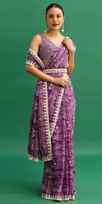 Presenting Purple Color Chinnon Silk Digital Prints Embroidery Codding Sequins Work Saree