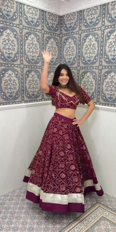 Maslin Flair : 4meter Work : Printed With Golden Patta Work Inner : Micro Semi Stitched Choli Detail _fabric : Maslin _ Un-stitched 1.2meter Printed And Lace Work Dupatta Detail Georgette With Digital Print And Mirror Work Dupatta (2.2mtr) |