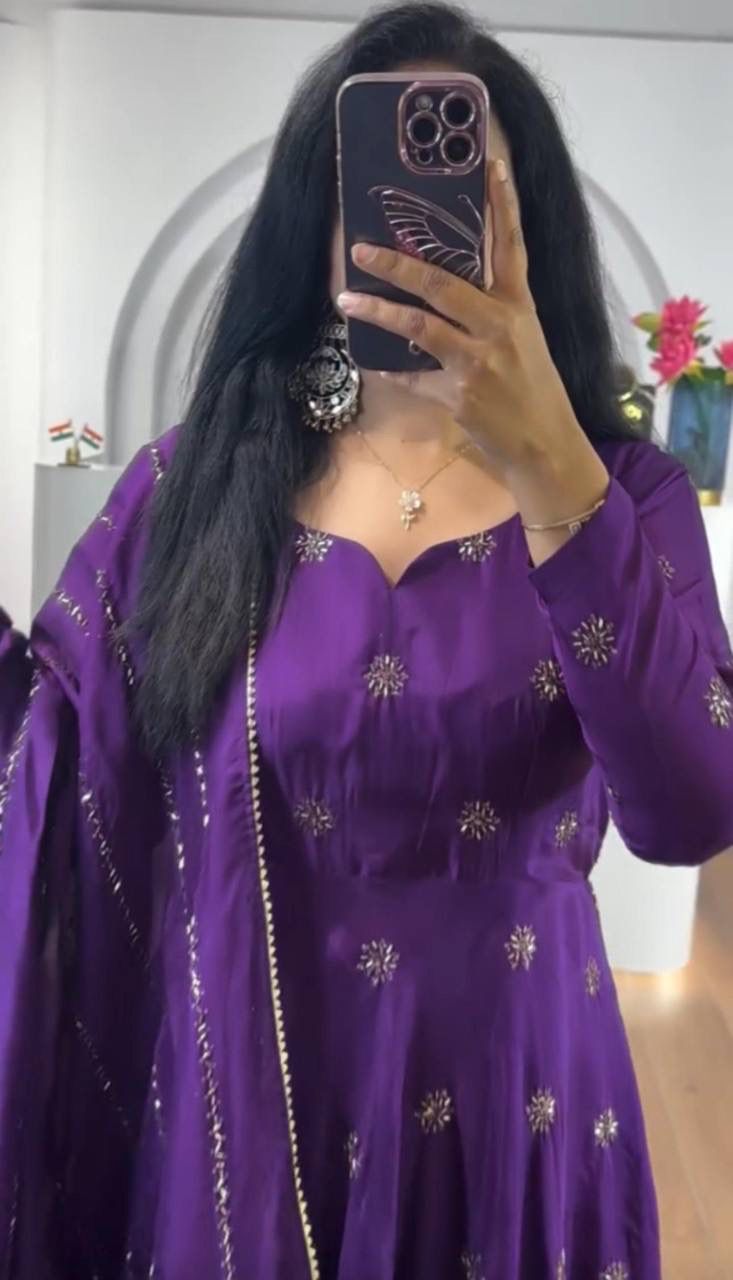 Purple Chinon Embroidery Work Gown