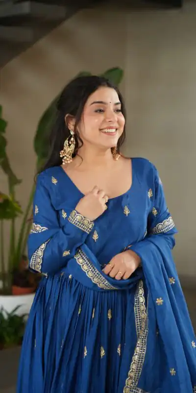 Gown :- Fabric & Work:- Chinon With Embroidery Zari Sequins-work Size: - Free Size Semi Stitched Length:- 56 Inch Flair:- 3.5 Mtr Lining:- Cotton (Full Inner Top To Bottom) Sleeve:- Full Sleeves Neck Type: - Round Neck Dupatta :- Fabric :- Chinon With Sequins Embroidered Work With Designer Lace Border Length :- 2.25 Mtr |