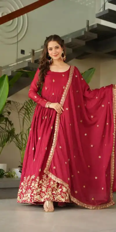 Gown :- Fabric & Work:- Chinon With Embroidery Zari Sequins-work Size: – Free Size Semi Stitched Length:- 56 Inch Flair:- 3.5 Mtr Lining:- Cotton (Full Inner Top To Bottom) Sleeve:- Full Sleeves Neck Type: – Round Neck Dupatta :- Fabric :- Chinon With Sequins Embroidered Work With Designer Lace Border Length :- 2.25 Mtr |