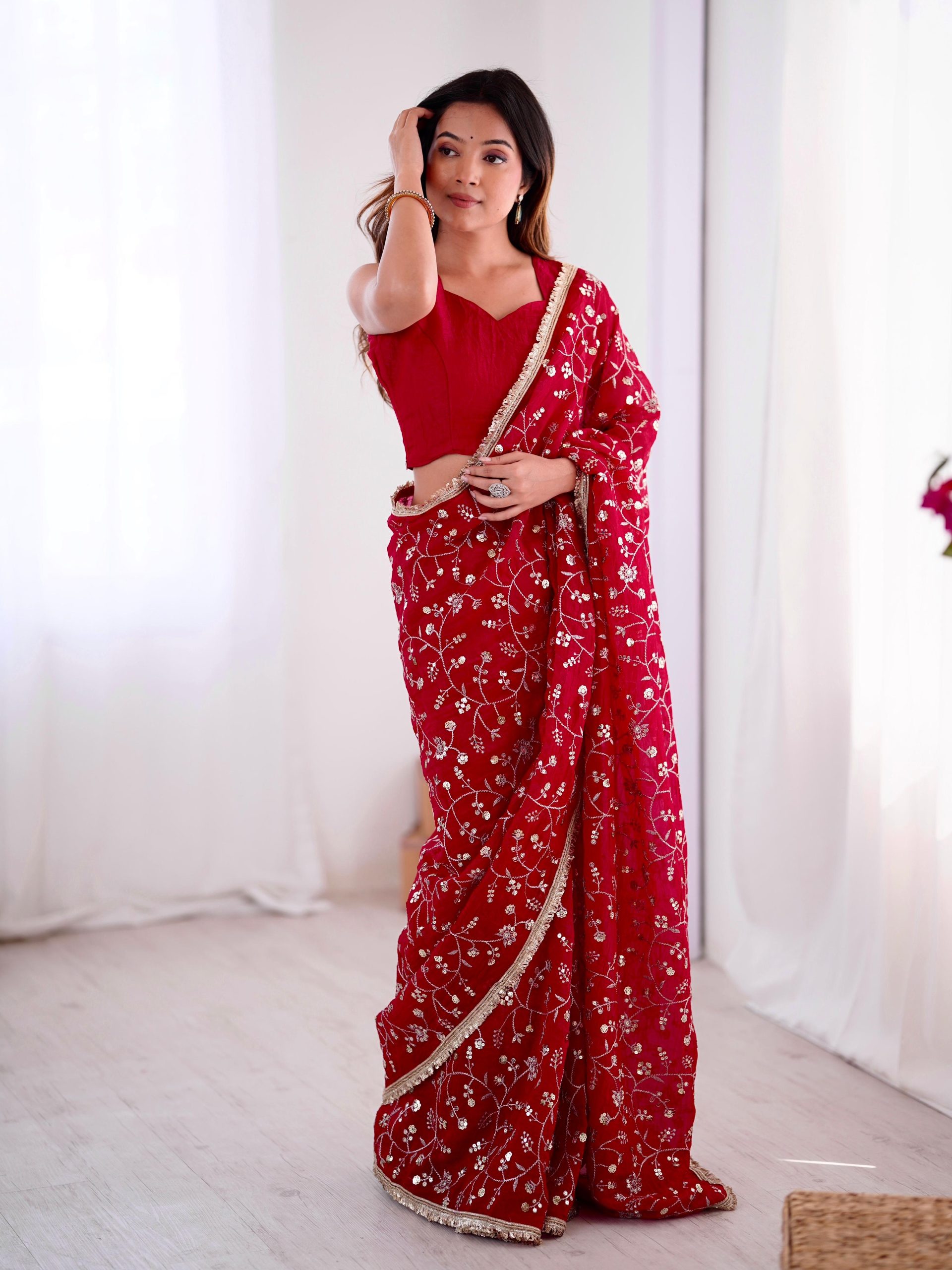 The saree has a beautiful pallu and detailed border that enhance its overall beauty. It feels light yet rich, making it perfect for weddings and cultural events.