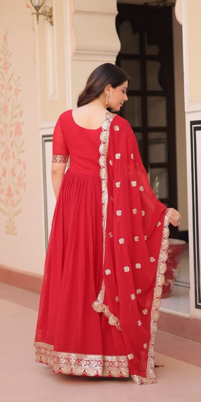 Gown :- Fabric & Work:- Faux Blooming With Embroidery Zari Sequins-work Size: – Free Size Semi Stitched Length:- 56 Inch Flair:- 3 Mtr Lining:- Cotton (Full Inner Top To Bottom) Sleeve:- Half Sleeves Neck Type: – Round Neck Dupatta :- Fabric :- Faux Blooming With Sequins Embroidered Work With Designer Lace Border Length:- 2.25 Mtr |