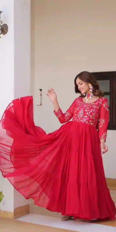 Fabrics | Gown Fabric:- Fox Georgette Work:- Heavy 3mm sequence Thread Work Inner:- Micro Cotton Flair:-7.50 mtr Size:- free Size Semi Stitched (Fully Stitched) |