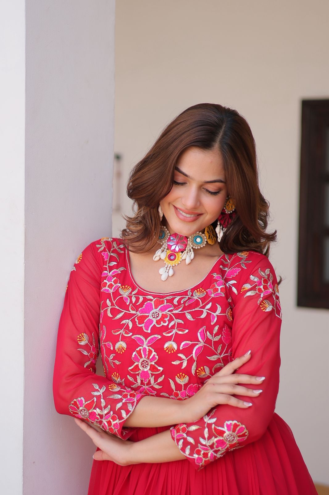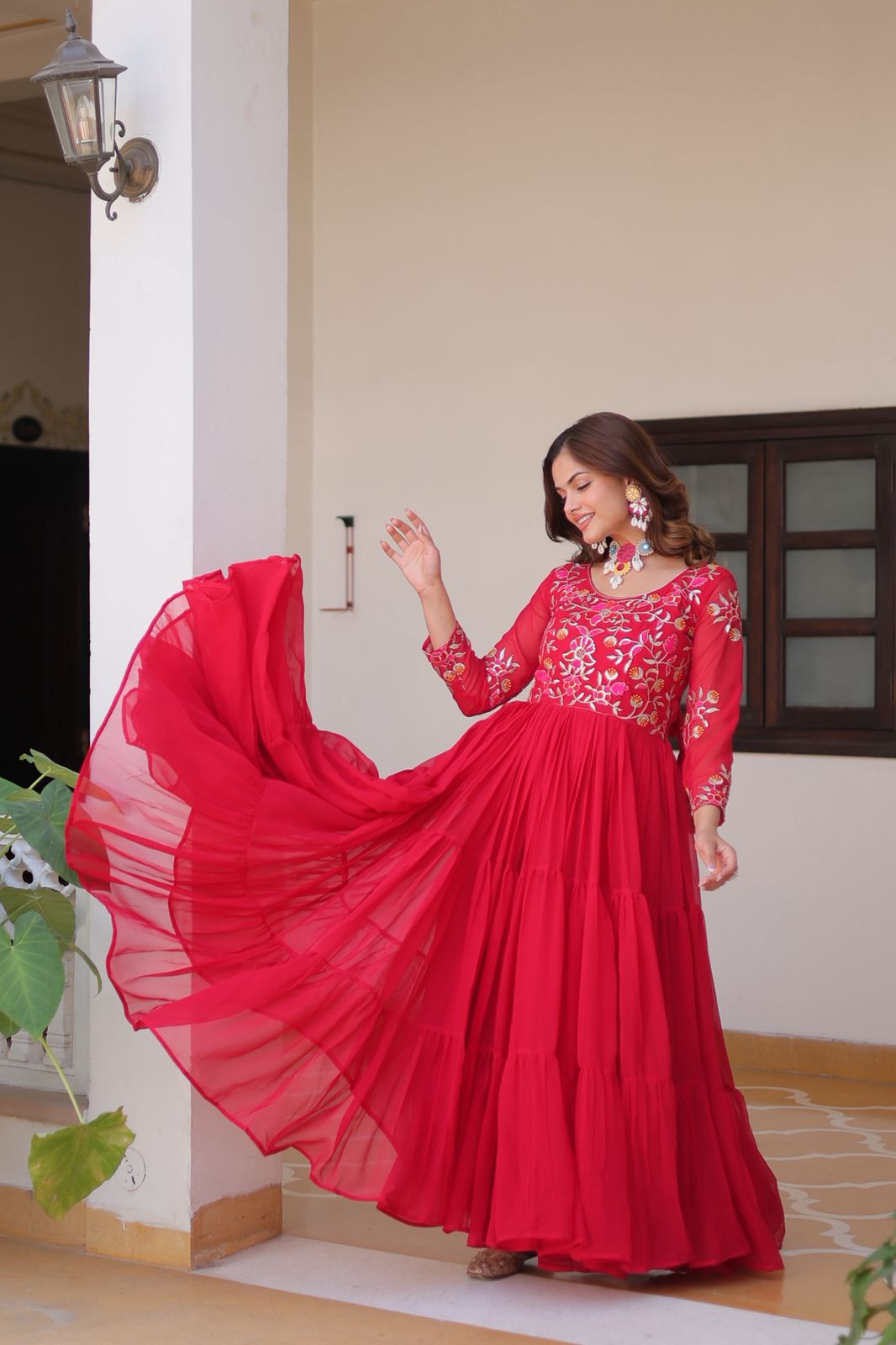 Fabrics | Gown Fabric:- Fox Georgette Work:- Heavy 3mm sequence Thread Work Inner:- Micro Cotton Flair:-7.50 mtr Size:- free Size Semi Stitched (Fully Stitched) |
