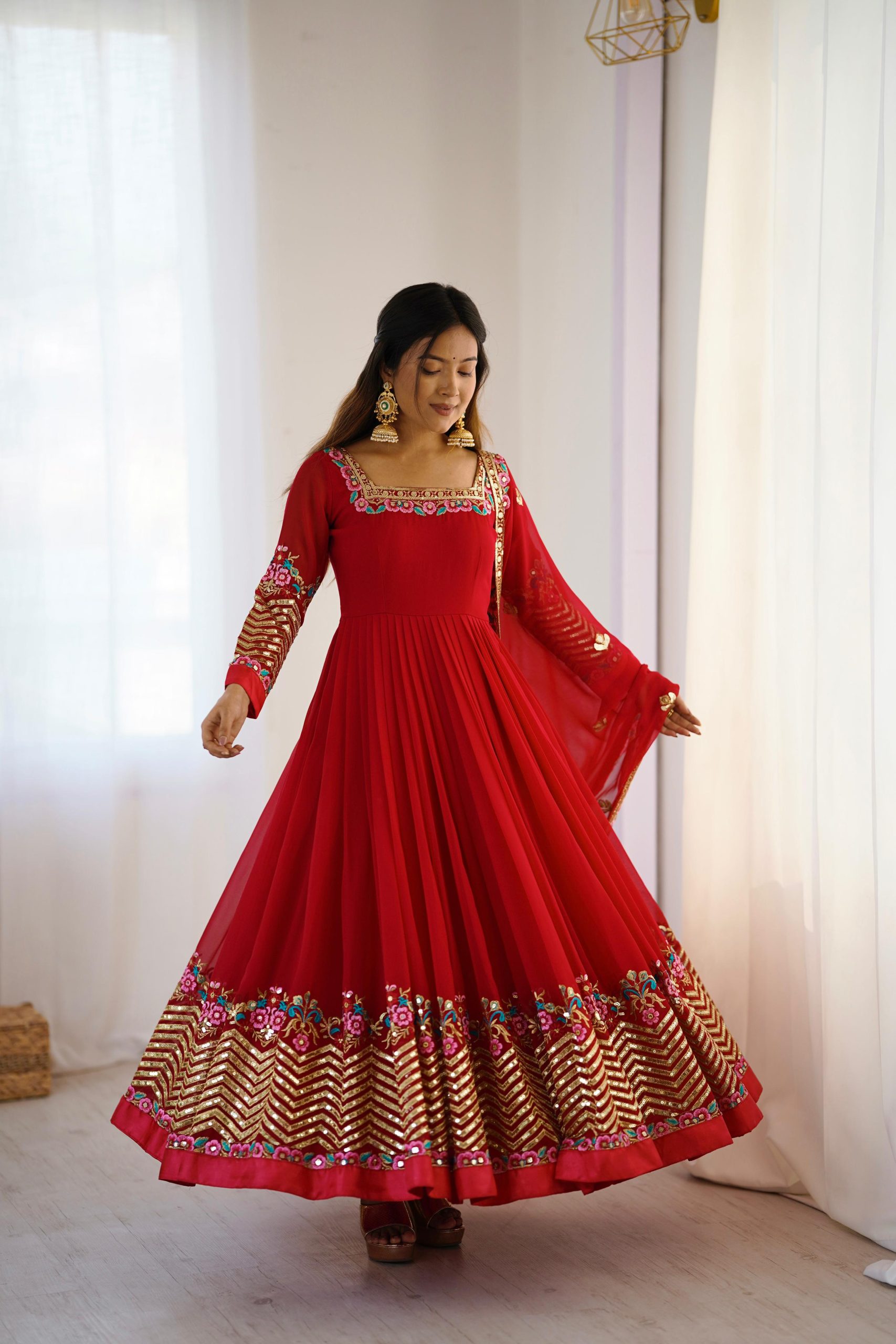 GOWN Fabric :- Heavy Georgette Work :- Heavy Multi Thread 5mm Embroidery Sequence Work Inner :- Heavy Micro Cotton Sleeves :- Full Sleeves Length :- 50 Inches Size :- Free Size Semi Stitched BOTTOM Fabric :- Heavy Micro Cotton Length :- 40-41 Inches DUPATTA Fabric :- Heavy Georgette Work :- Heavy Multi Thread Embroidery Sequence Work Length :- 2.10 meter |