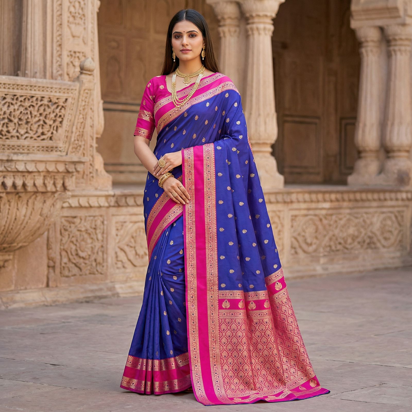 Blouse :-   Contrast Matching silk weaving blouse piece with zari motifs and coordinated border for a complete traditional look.