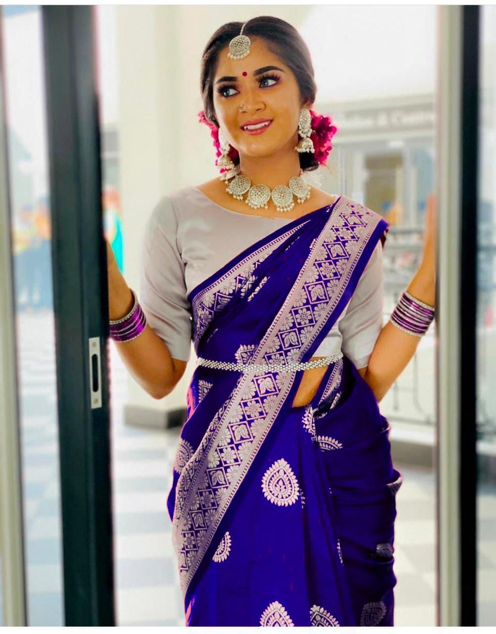 Royal Blue Soft Lichi Silk Lace Work Border Saree