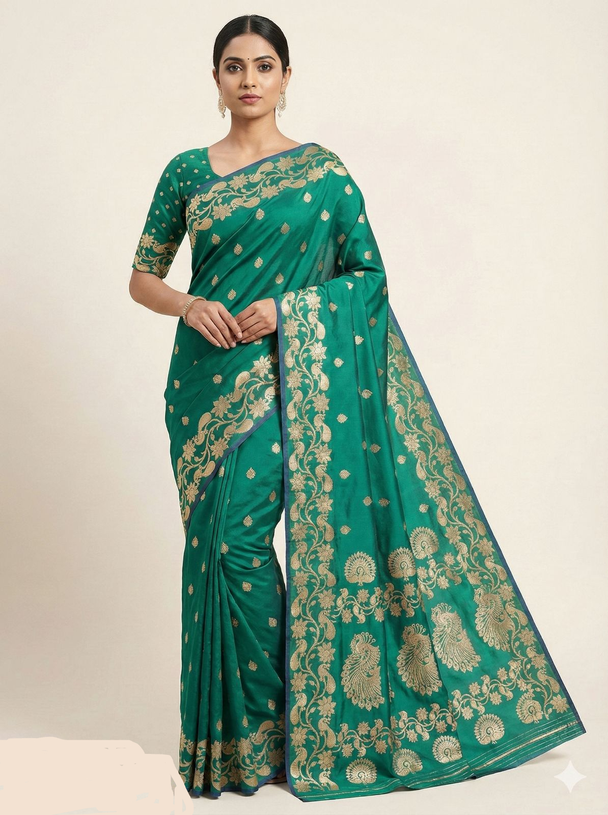Blouse :- Matching soft pure silk weaving blouse piece with subtle zari motifs and a coordinated rich border for a complete graceful look.
