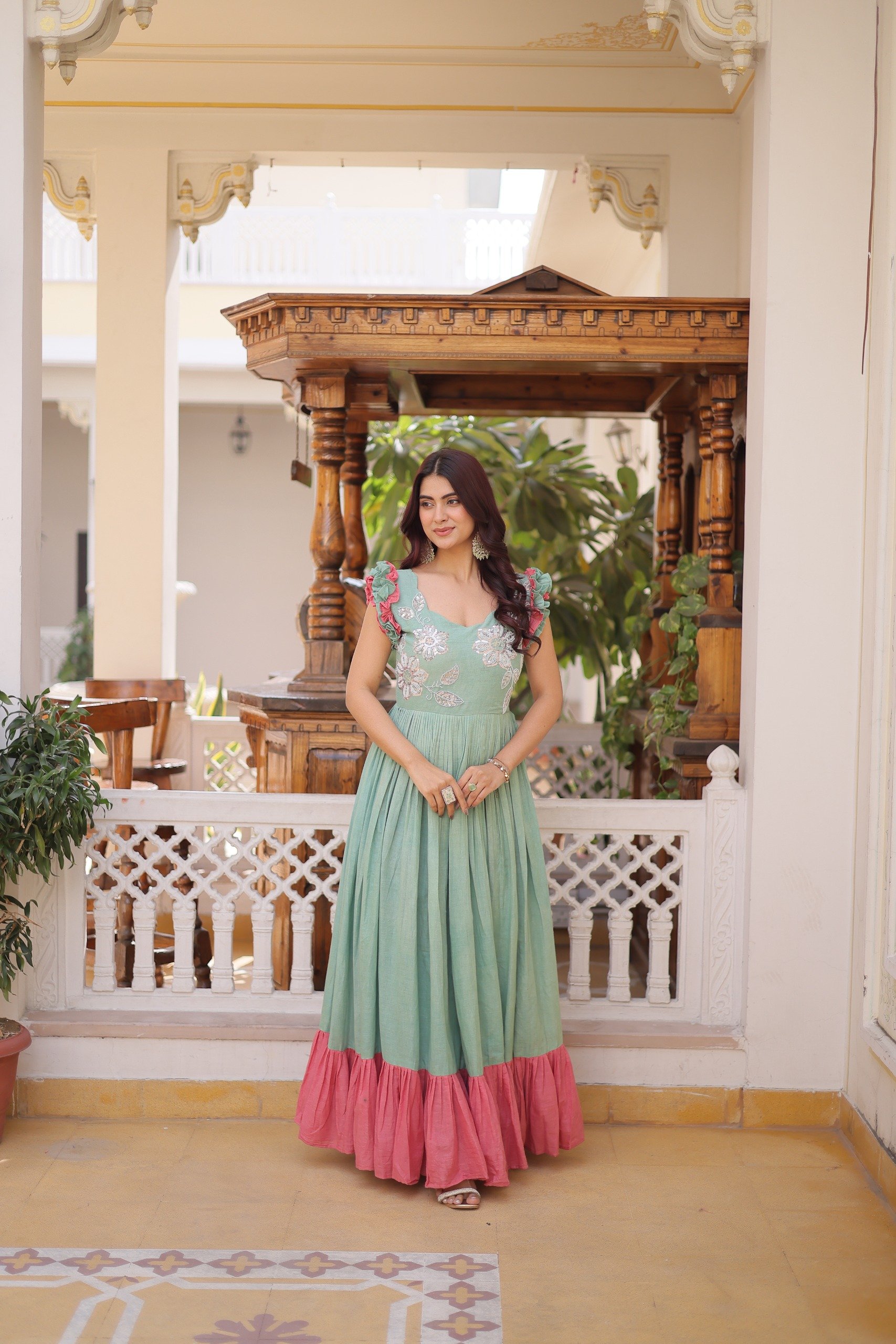 KA 1234 Sea Green Color Cotton Gown with Sequins Work & Embroidery Work. Festive Deal ₹1819. Delivery 4-6 Working Days. Shop now. | Gowns, Bollywood Gowns, Creative Gowns, Designer Gowns, Embroidered Gowns, Party Wear Gowns