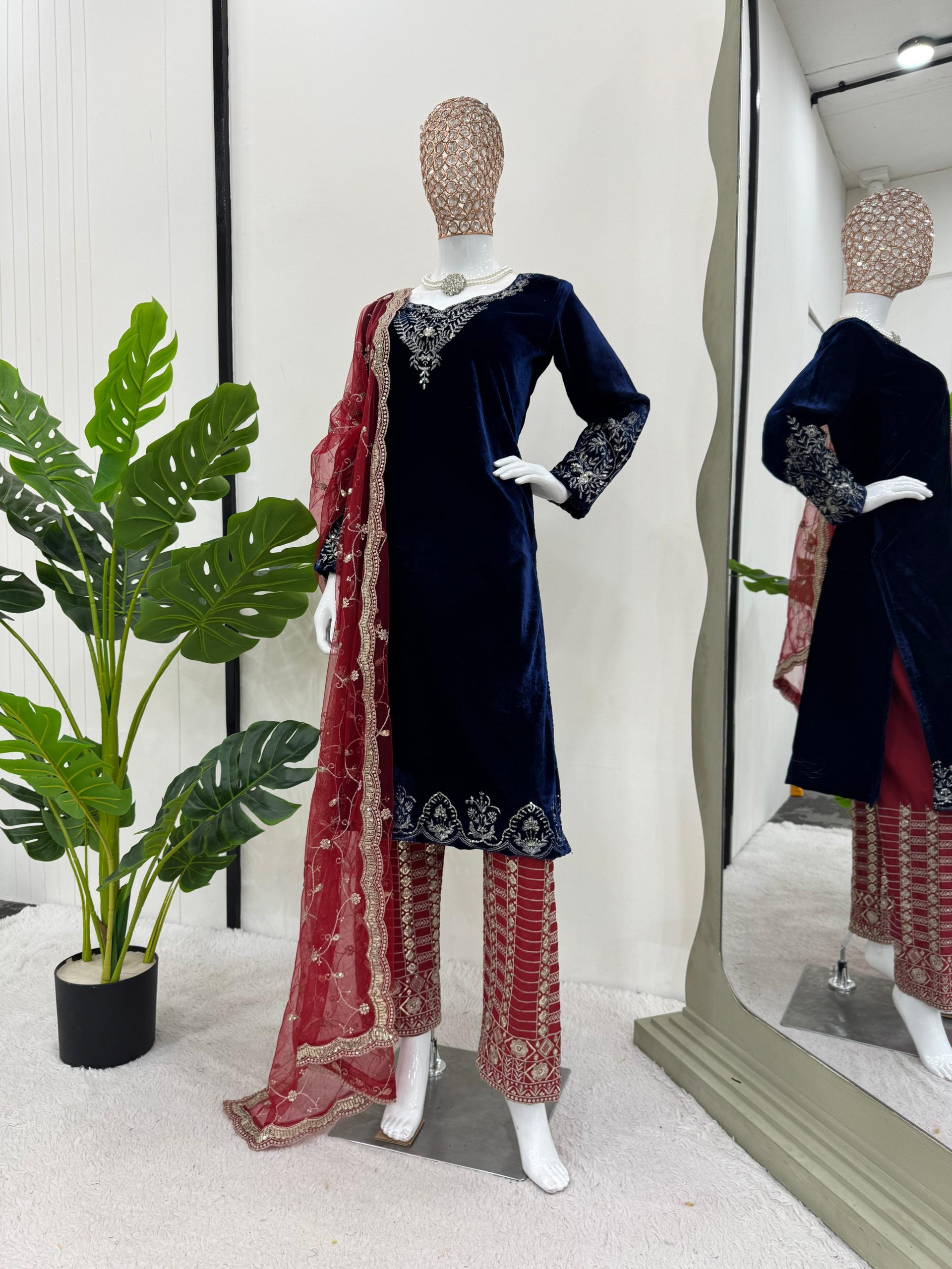 | Fabrics | Top Fabric : Viscos velvet Inner : Micro Work. : Thread with Sequnce Stich. : M(38), L(40), XL(42), XXL(44)PentFabric :- Micro cotton Inner. :- micro Work. :- thread with Sequnce Stich :- Full stich upto 44 with elasticDupata Fabric : Butterlfy net |