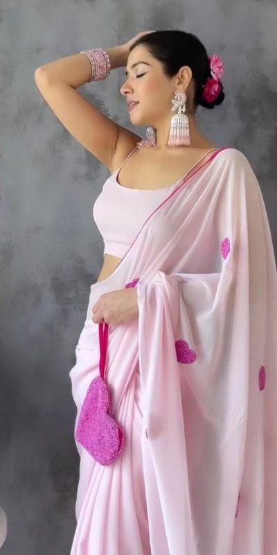 | Fabrics | Saree :Soft Georgette Silk work :embroidery pink heart design Ready To Wear saree design in All over Blouse :embroidery Blouse piece |