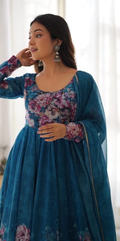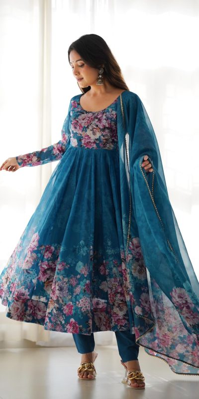 KB 261 Rama Color Soft Organza Silk Print With Kali Gown Casual, Wedding, Party, Festive, Events Etc.4-6 Working Days@ 1999/-only