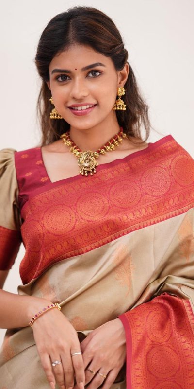 Sublime Golden Color Soft Silk Copper Zari Design Spread Saree