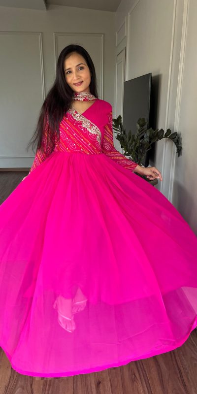 | Fabrics | Fabric:- pure Bandhej with Fox Georgette Work:- 3mm sequence Embroidery work Flair:- 3.5mtr Inner:- Micro Cotton Size:- Free Size Sami Stitched Fully StitchedDupatta Fabric :- Fox Georgette Work :- 3mm sequence Embroidery work Length:- 2.30 Meter |
