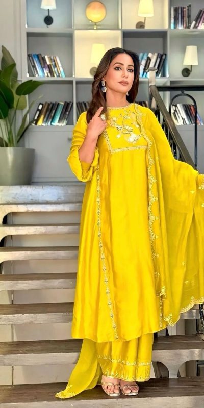 “The salwar suit’s anarkali silhouette is gracefully designed. It adds a sense of drama and elegance to the overall ensemble.”