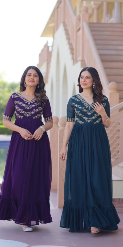 Teal Faux Blooming With Embroidery Work Gown