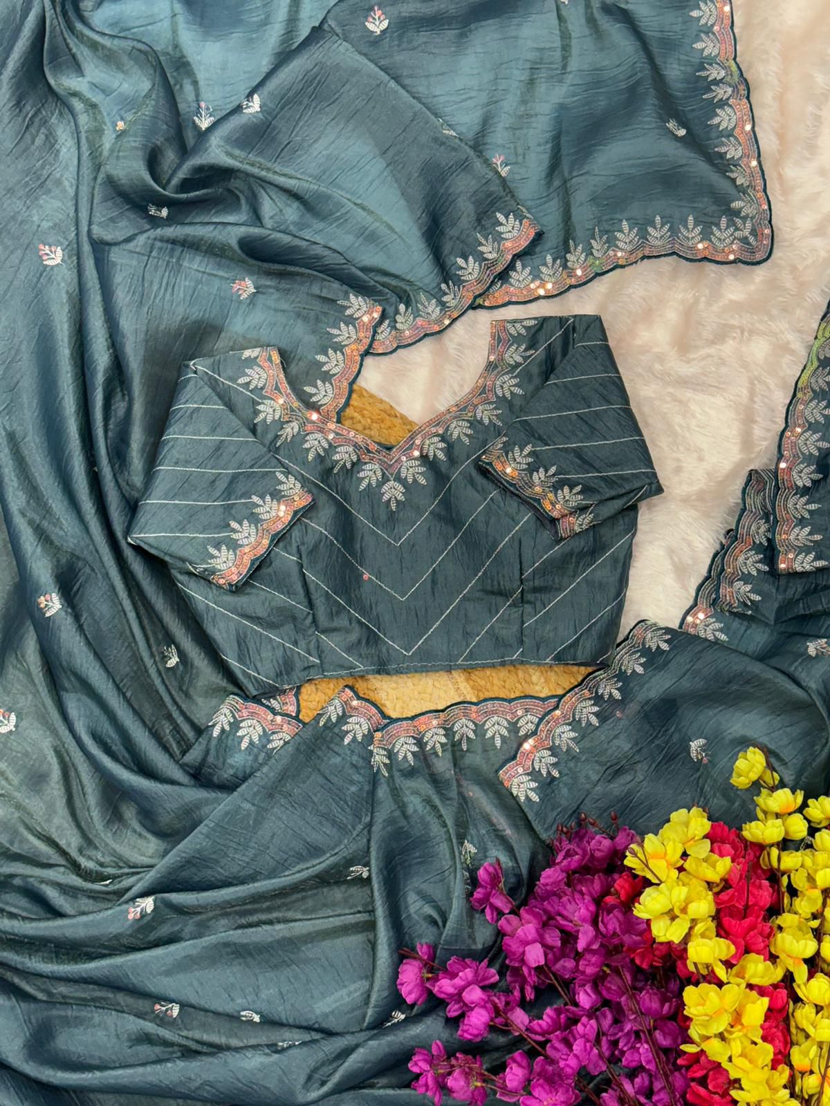 Teal Gold Crush Embroidery Work Saree