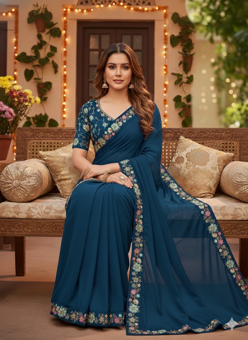 Teal Star Georgette Lace Embroidery Work Saree