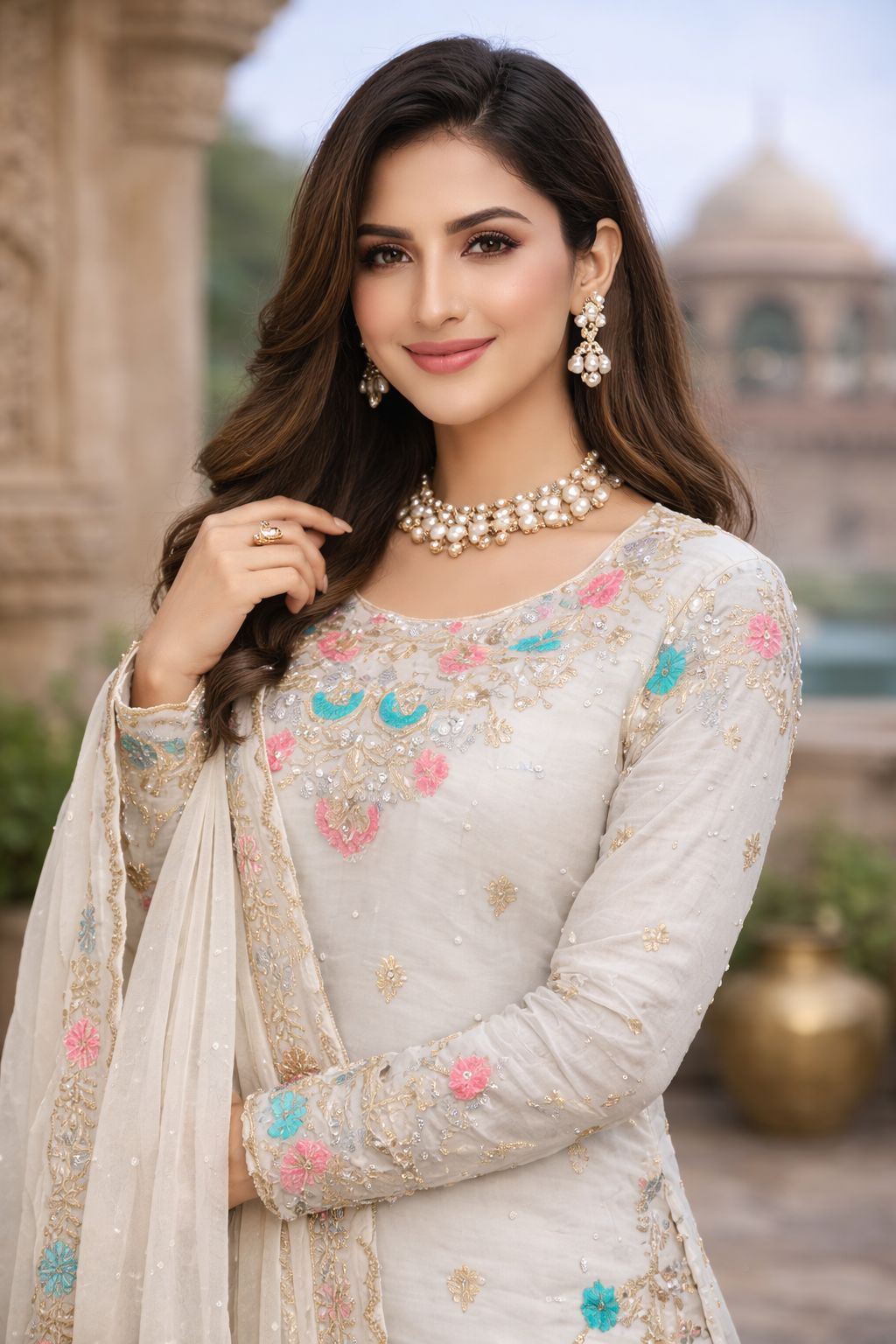 White Organza Silk Sequence Moti Work Salwar Suit