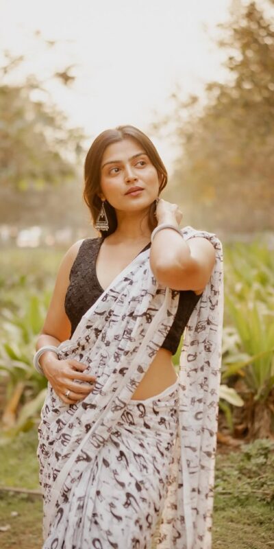 White Soft Linen Cotton Digital Print Lace Work Saree