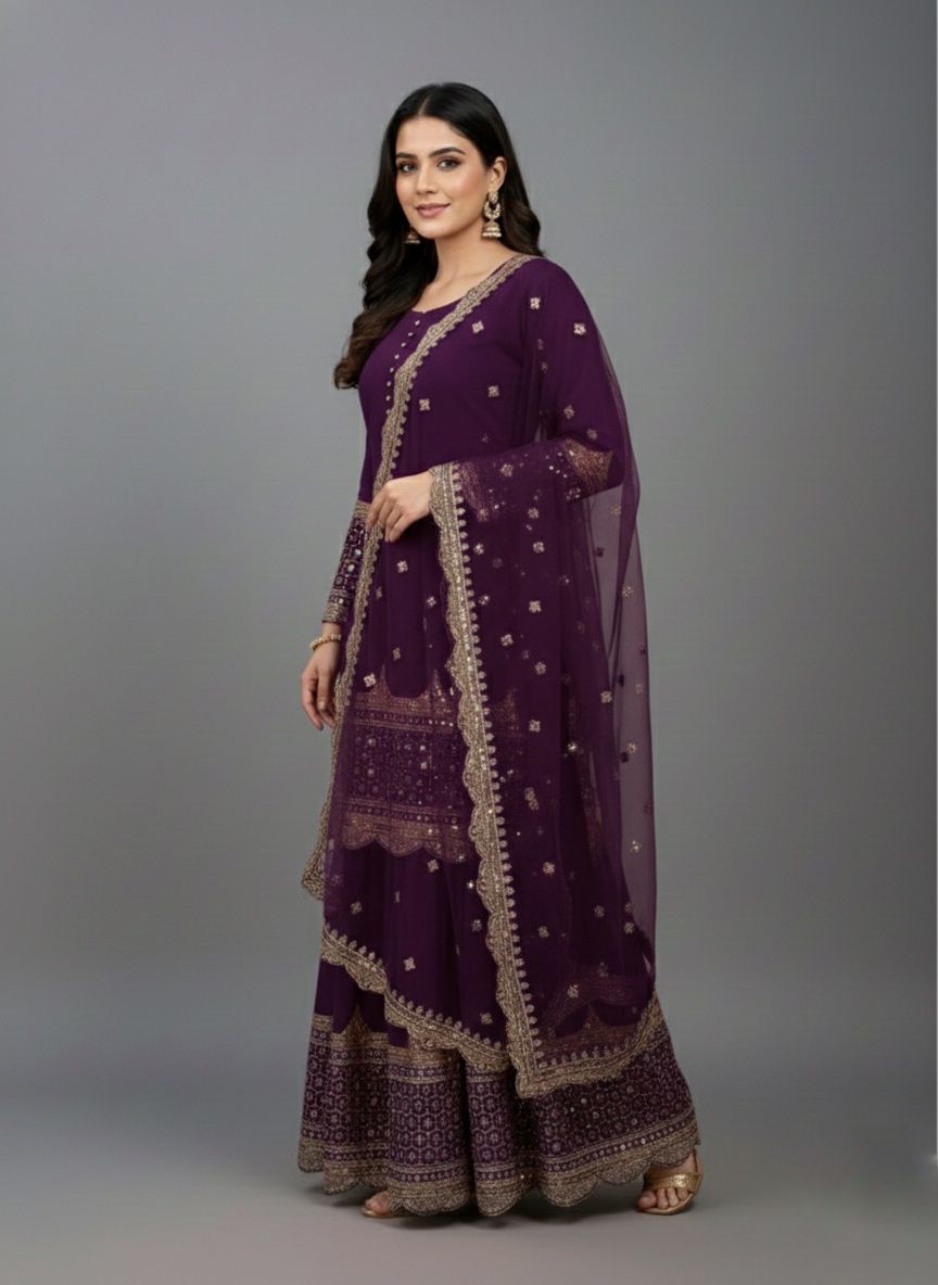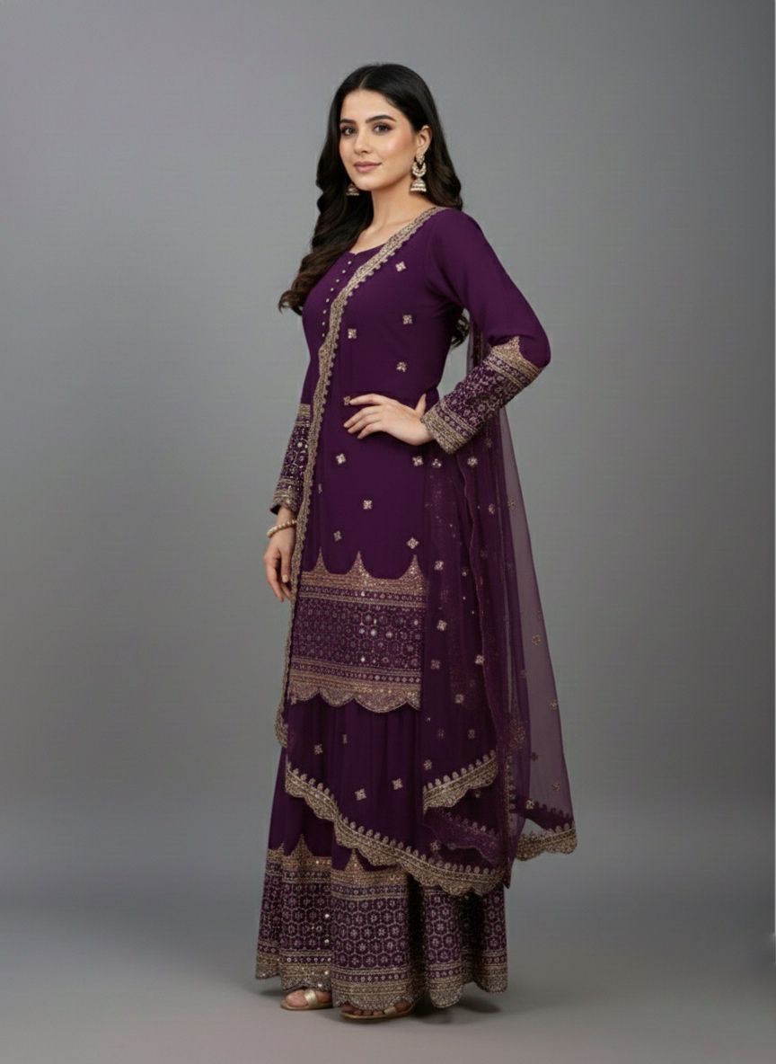 Top : Heavy Faux Georgette With Heavy 5mm Embroidery Sequence Work With Full Sleeve and Potli Button Inner : Heavy Micro cotton Length : 37-38 Inch Size : Free Size Work :Embroidery Sequence Work Type : Semi Stitched Palazzo :Heavy Faux Georgette With 5mm Embroidery Sequence Work With Fully Flair Palazzo inner :Heavy Micro Cotton Palazzo Length:40-41 InchDupatta : Heavy Net With 5mm Embroidery Sequence Work and Lace Border |