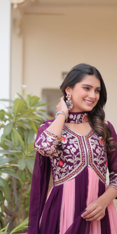 Wine Fox Georgette Embroidery Thread Work Gown