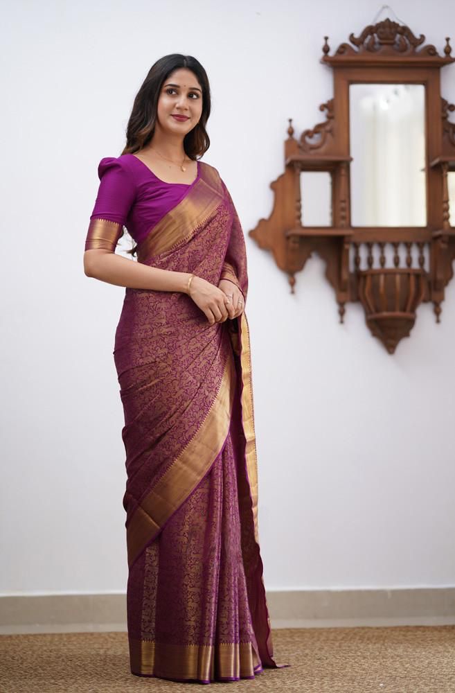 Perfect Purple Color Dola Silk Printed With Zari Border Saree