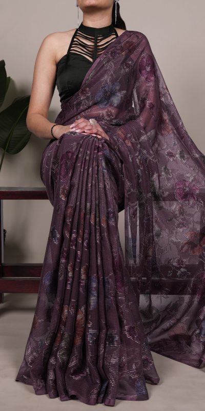 Wine Lurex Brasso Floral Saree
