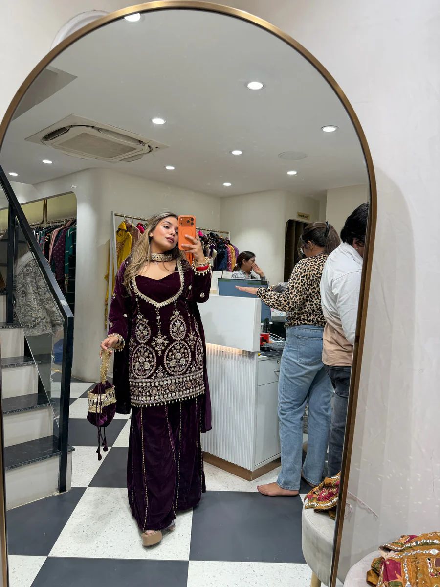 Wine Velvet Embroidery Mirror Work Salwar Suit