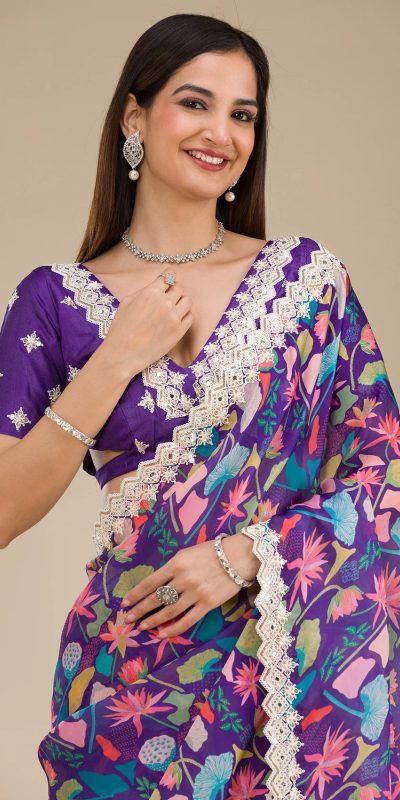 BT-403 Violet Color Georgette Digital Prints & Embroidery Codding Sequins Work Saree Casual, Wedding, Festive, Events . Expected Delivery 4-6 Working Days @1899/- only