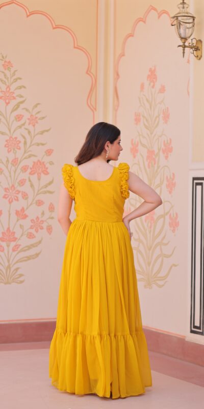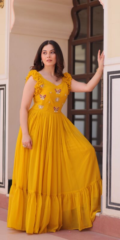 Gown :- Fabric & Work :- Faux Blooming With Sequins Multi threaded Beads Embroidered Work. Size :- Free Size Semi Stitched Length :- 56 Inch Flair :- 7 Mtr Lining :- Cotton (Full Inner Top To Bottom) Sleeves :- Sleeves less (Shoulder Double Frill Stitching) Stitching Type:- Frill Stitch Neck Type :- Fancy V Neck |
