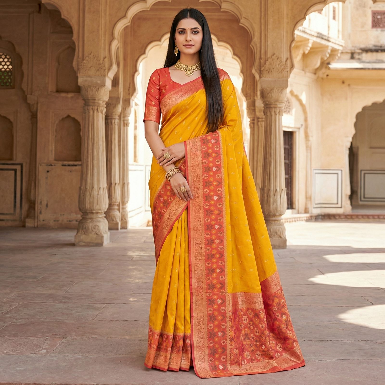 Ikkat Pattern Contrast Border & Pallu with Zari Border which will give you a comfortable yet attractive look. The best part of this is its woven work.